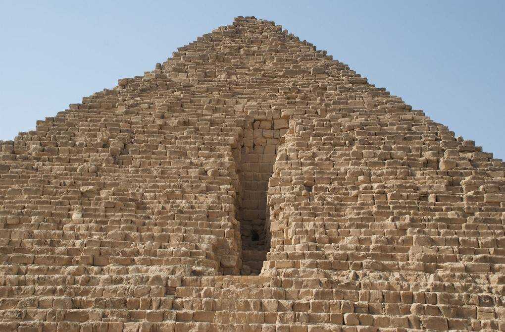 На одной из боковых стен пирамиды Микерина есть большая вертикальная брешь. Добираясь до сокровищ фараона в погребальную камеру внутри пирамиды, грабители разобрали часть стены сверху донизу. В образовавшемся таким образом «вертикальном разрезе» участка внутренних блоков пирамиды открылось следующее – с определенной, четко выраженной границы верхние блоки уложены не плотно и не так аккуратно, как нижние. Это подтверждает то, что пирамида достраивалась и что более поздние строители не так тщательно следили за качеством укладки внутренних блоков.