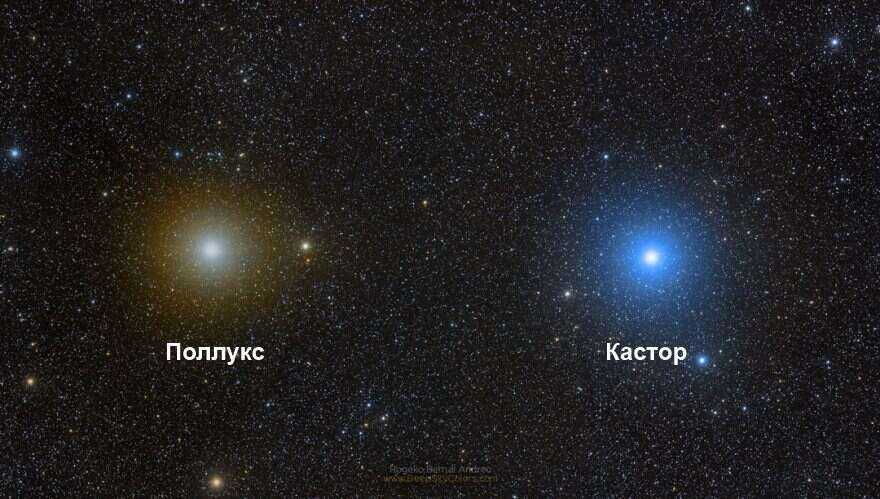 Космические объекты действительно находятся на значительном расстоянии друг от друга. В созвездие, помимо оранжевого Поллукса и белого Кастора, входят: