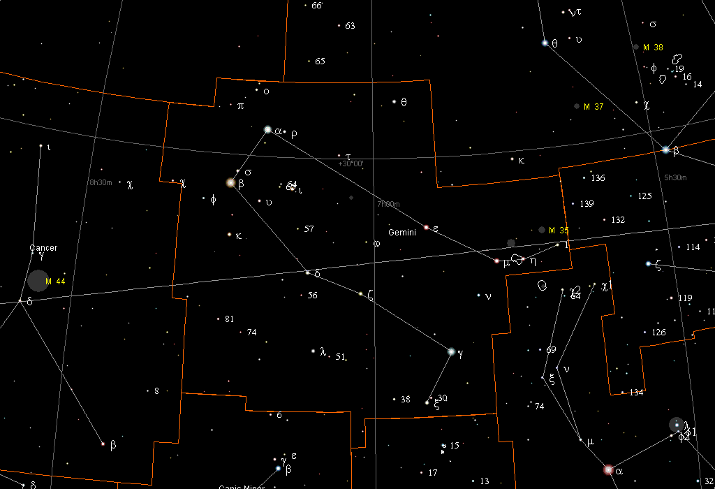 - 16 других больших звезд (M35, Alhena, Epsilon Gemini, Propus, Eta Gemini, Wasat, Mekbuda и другие)