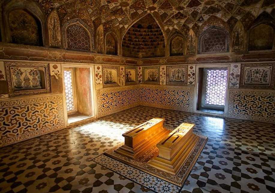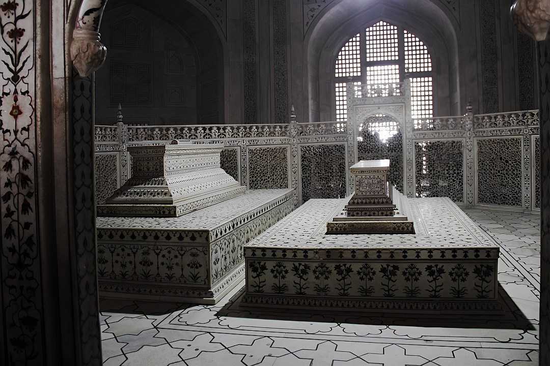 В центре внутреннего зала, за двумя резными ширмами из мрамора, стоят два кенотафа — надгробных камня Шах-Джахана и его супруги. Сами могилы находятся глубоко под полом.