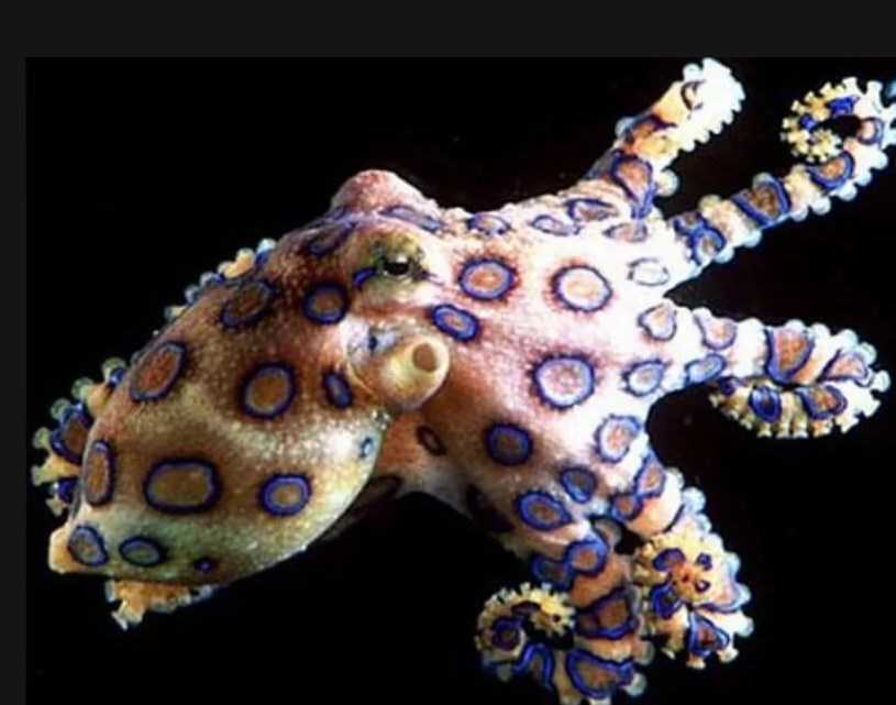 - Все осьминоги ядовиты, но лишь немногие виды представляют серьезную угрозу для человека. Осьминоги с синими кольцами в роду Hapalochlaena, которые живут вокруг Австралии и Новой Гвинеи, кусают людей только в случае сильной провокации. Уровень смертности от их укусов составляет 25%. Другой тропический вид – Octopus Apollyon, вызывает сильное воспаление, которое может длиться более месяца, даже если его правильно лечить, а укус Octopus rubescens может вызывать длительный некроз.