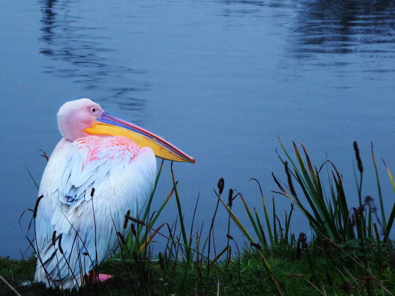 Розовый пеликан – это сравнительно небольшая птица. Длина крыльев самца составляет около семидесяти сантиметров, у самки немного меньше. Оперение обоих имеет бледно-розовый оттенок, у молодняка серо-бурый. Оттенок взрослой птицы они приобретают к трём годам жизни, когда становятся половозрелыми особями. Питаются рыбой, опуская свои длинные шеи в воду.