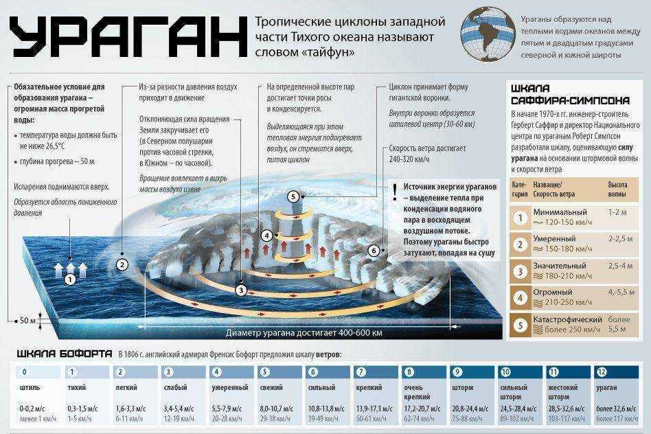 На картинке ниже дано объяснение того, как образуется ураган, а также перечислены виды стихийного бедствия по шкале Саффира-Симпсона.
