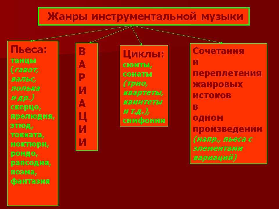 В дальнейшем развитие музыкальных жанров происходило очень быстро. Сегодня выделяют 4 их категории: